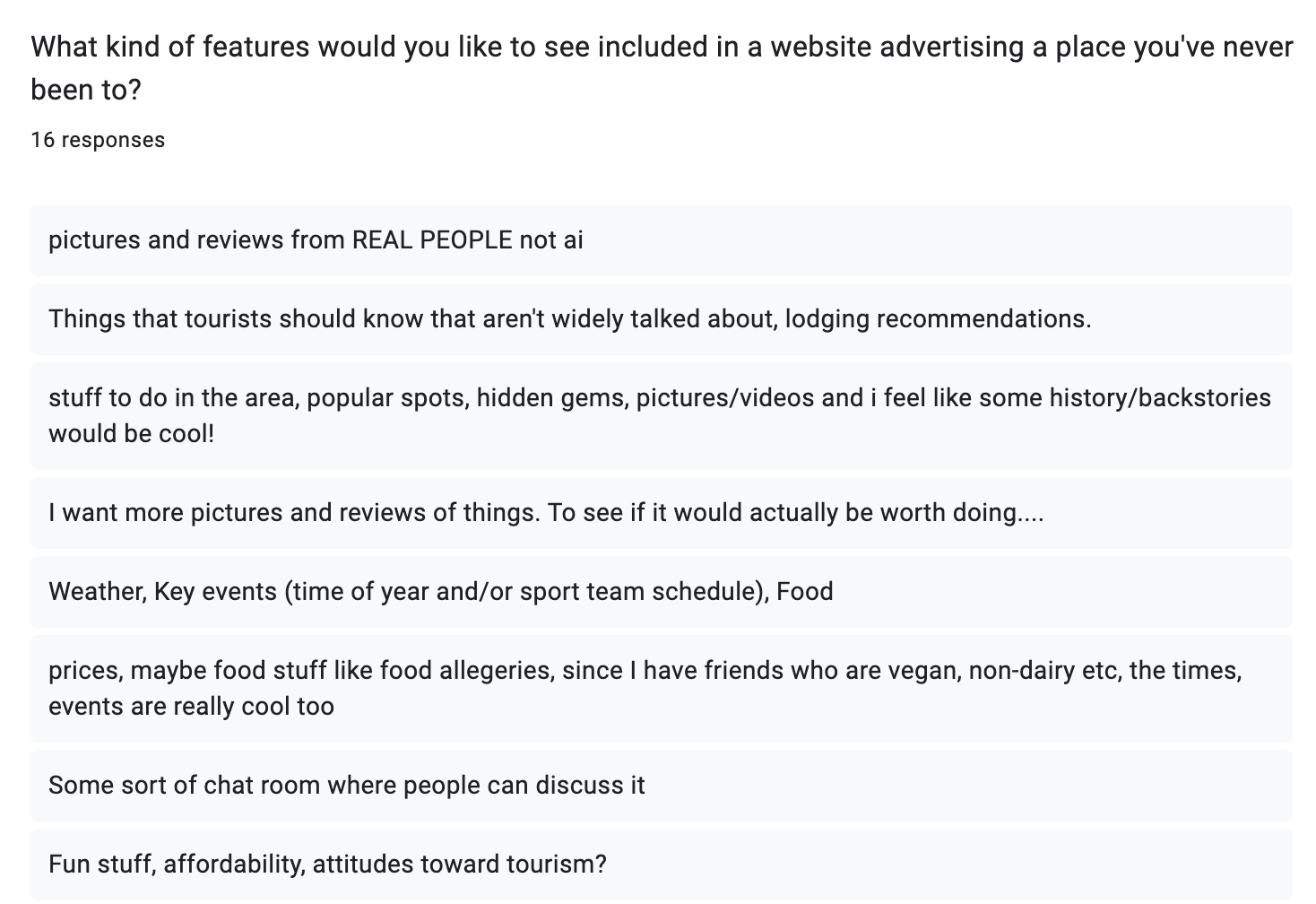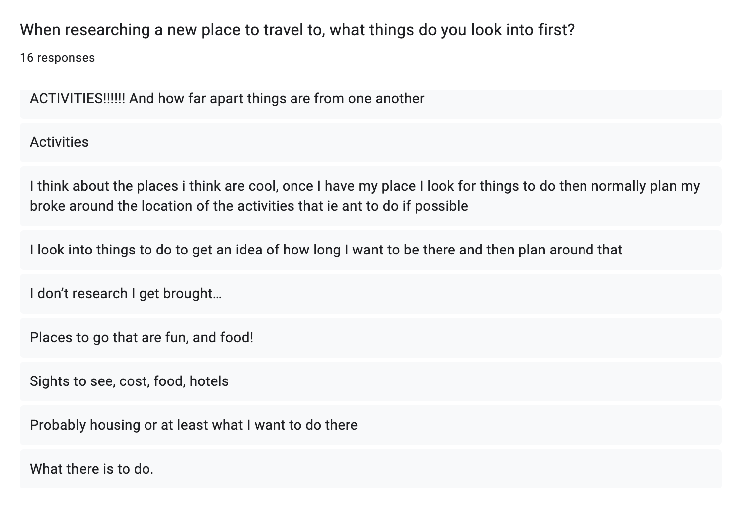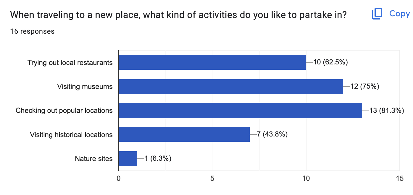 From the results, I noticed that people were traveling to partake in city-specific activities and were also interested in seeing recommendations from those who live in the city.