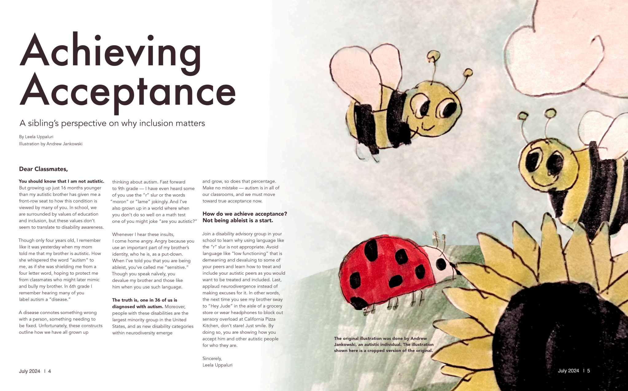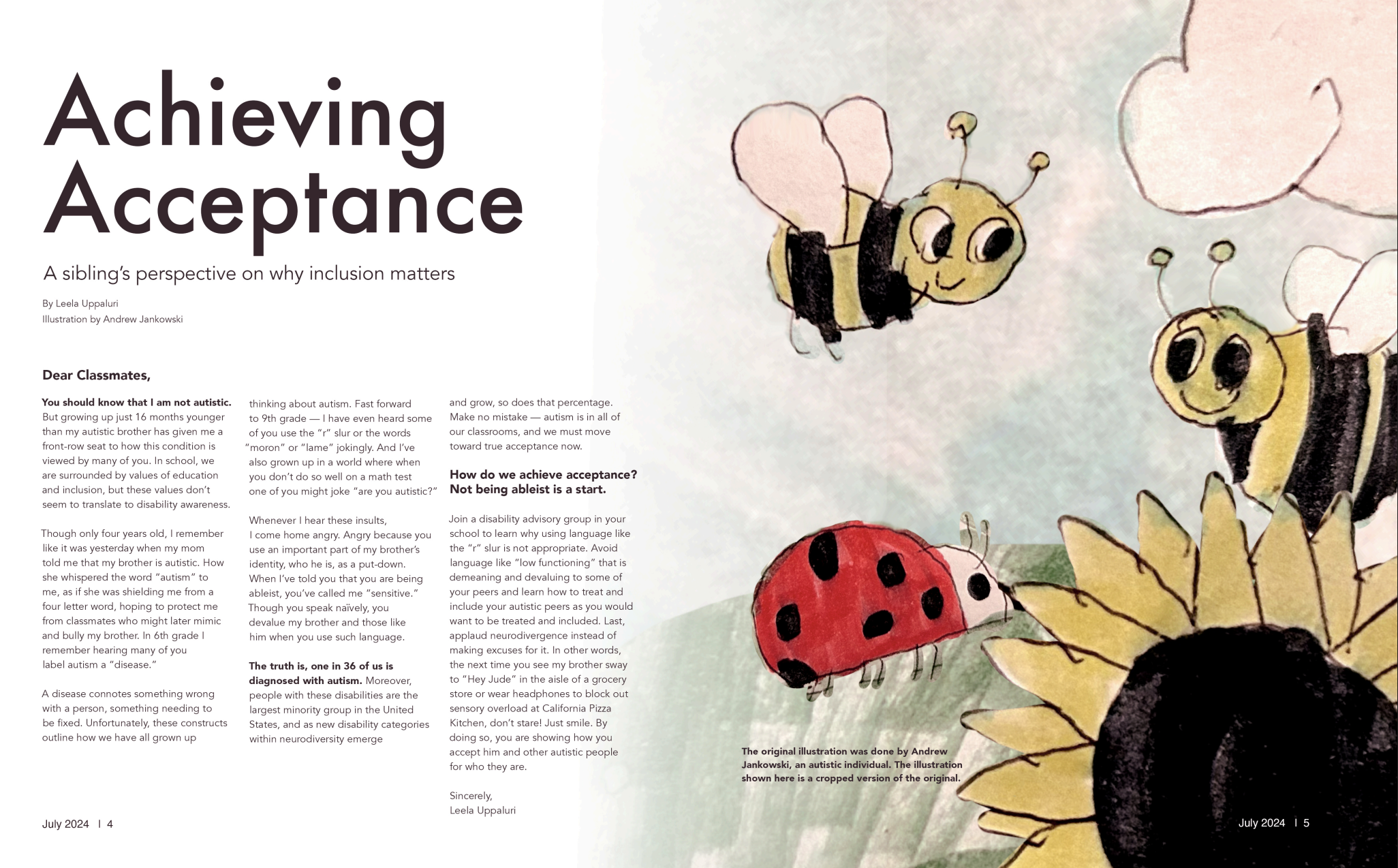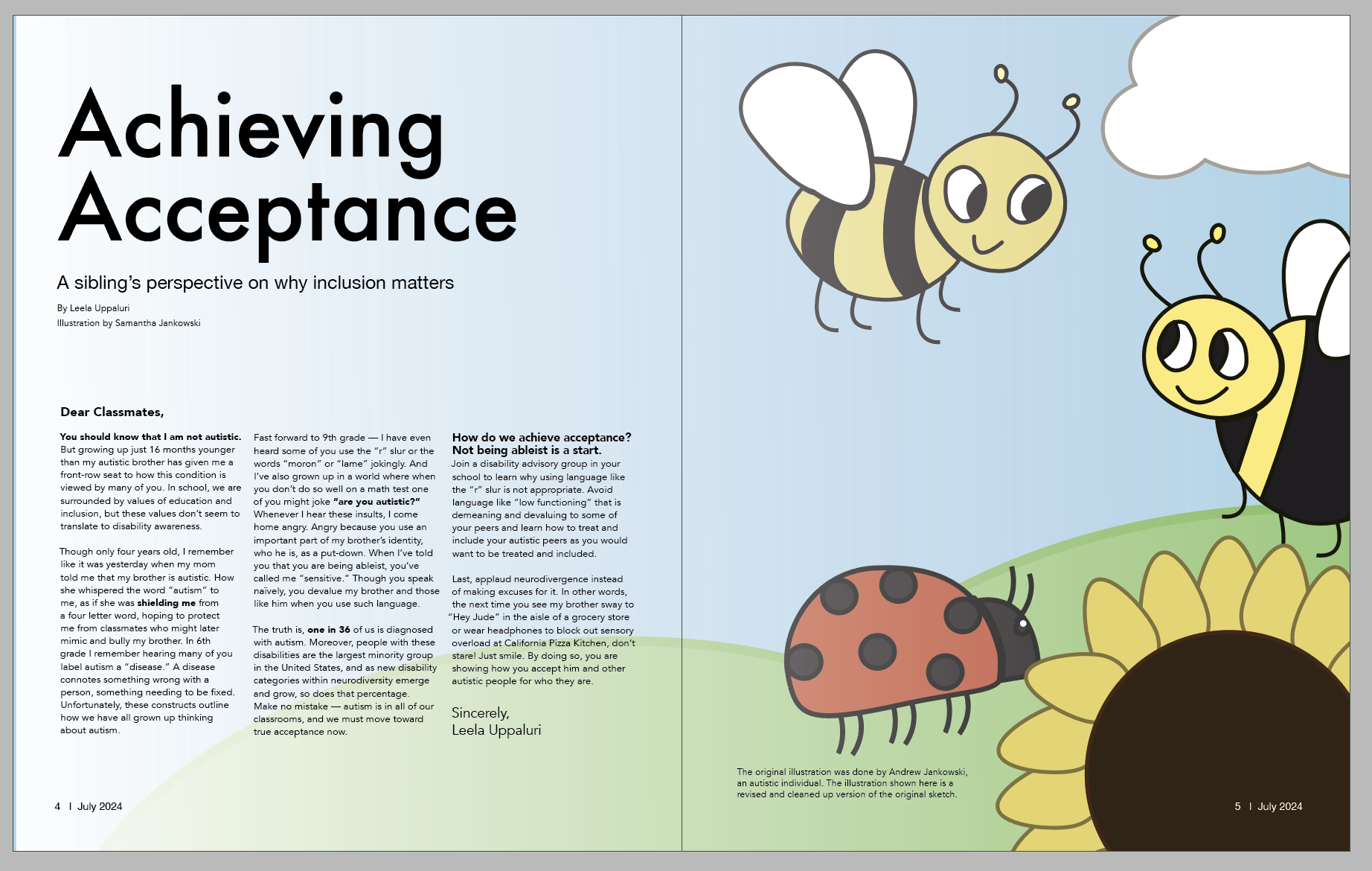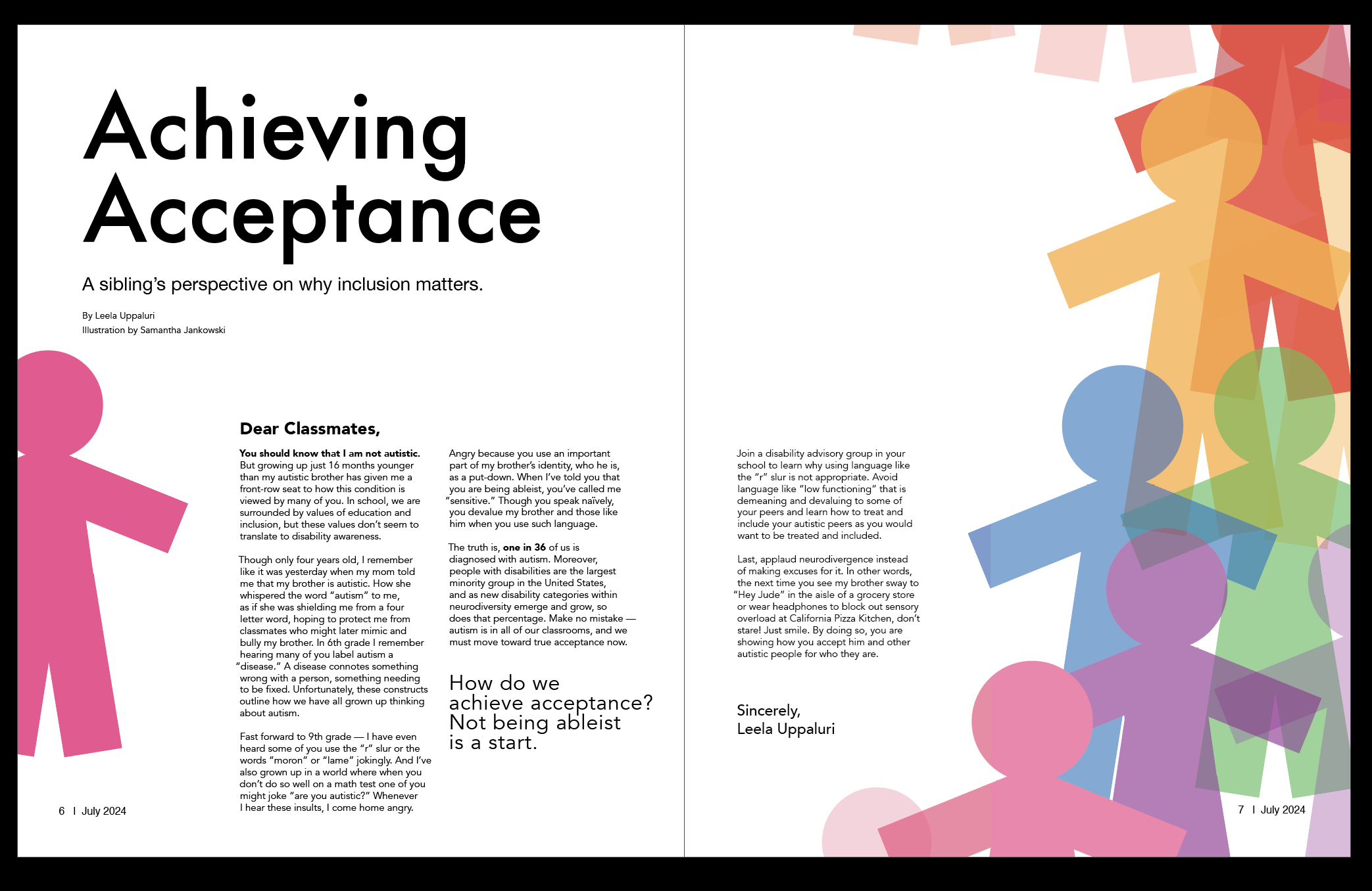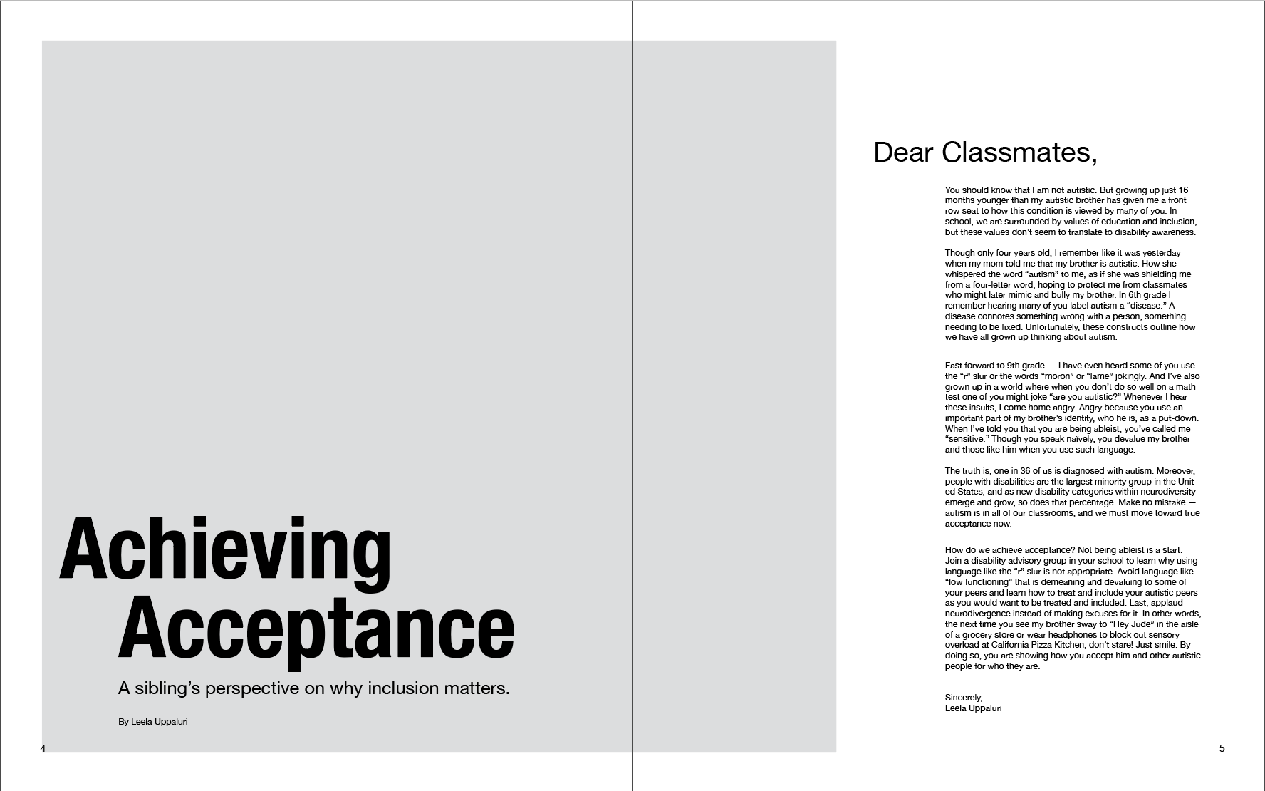 I decided to choose the article “Accepting Autism” by Leela Upaluri. In this article, the author shares her feelings on the discrimination her brother faces daily and how we should be more accepting of those who are on the spectrum. I felt connected to this article because I could personally relate to the sentiment, as my older brother has autism.